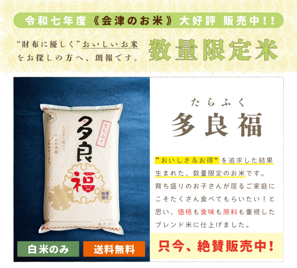 【販売開始】家計応援!食味保証!五ッ星マイスター謹製会津米100%コシヒカリブレンド米【多良福】七年産90%使用